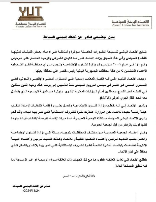 ودعا الاتحاد في بيانه إلى تعزيز التعاون مع جميع الجهات الرسمية وغير الرسمية لتحقيق المصلحة العامة وتطوير القطاع السياحي في اليمن.