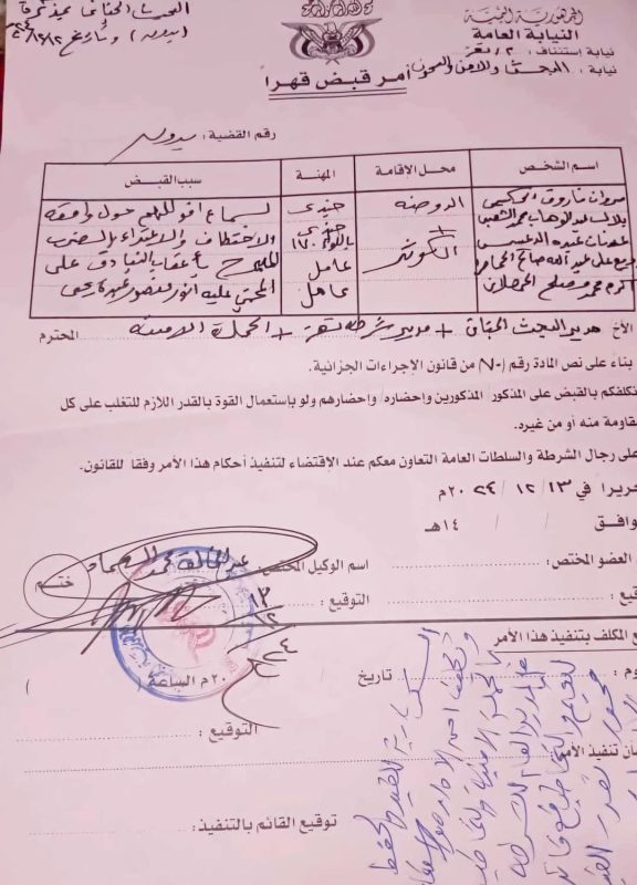 أصدرت الأجهزة الأمنية في محافظة تعز أمرًا قهريًا بحق أربعة أشخاص متهمين بالاعتداء على المغترب أنور منصور عبده، الذي لقي حتفه عقب اعتقاله في قسم شرطة عصيفرة بمدينة تعز.