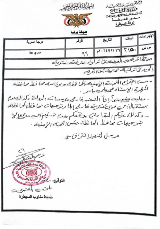 كما شدد التوجيه على جميع القوات الأمنية في المهرة بالبقاء في مواقعها وعدم تسليم أي موقع عسكري إلا بتوجيهات مباشرة من محافظ المحافظة، رئيس اللجنة الأمنية.