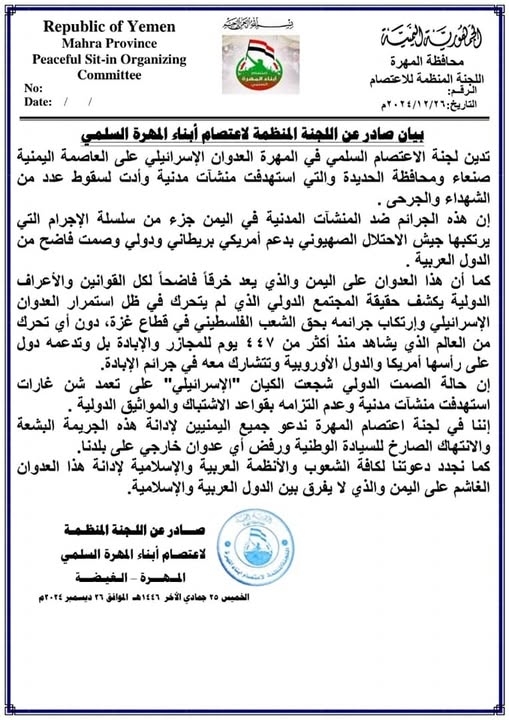 أدانت لجنة الاعتصام السلمي في محافظة المهرة، “العدوان الإسرائيلي” على العاصمة اليمنية صنعاء ومحافظة الحديدة، والذي استهدف منشآت مدنية وأسفر عن سقوط عدد من الضحايا بين قتلى وجرحى.