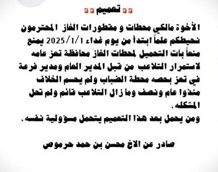 وفي سياق متصل، أصدر محسن حرموص، بتوجيه من أمين توفيق عبدالرحيم، صاحب محطة الضباب في تعز، تعميمًا يقضي بمنع تعبئة محطات الغاز في تعز ابتداءً من 1 يناير 2025، الأمر الذي أثار استياءً واسعًا بين المواطنين.