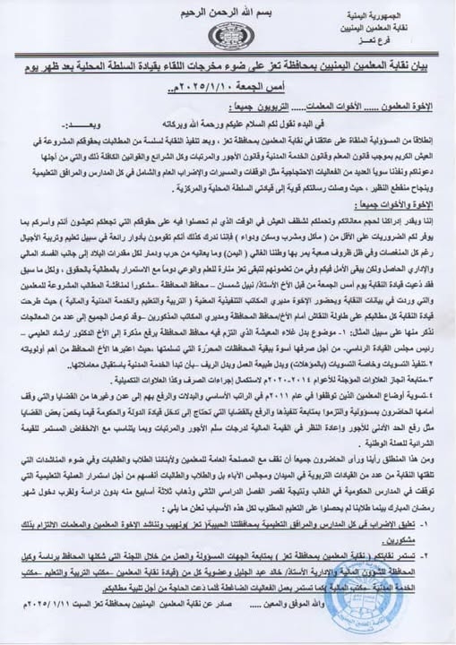 أعلنت نقابة المعلمين بمحافظة تعز اليوم السبت عن تعليق إضرابها الشامل في جميع المدارس والمرافق التعليمية بالمحافظة، ودعت جميع المعلمين والمعلمات إلى استئناف العملية التعليمية والعودة إلى الفصول الدراسية.
