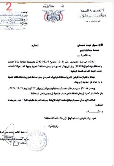 وفي خطوة تعكس محدودية الخيارات المتاحة، أحالت وزارة الخدمة المدنية والتأمينات مسؤولية إيجاد حل لمشكلة رواتب المعلمين إلى السلطة المحلية في تعز، مطالبة إياها بالبحث عن آليات لتدبير مبالغ الزيادة المقترحة من خلال الإيرادات المحلية المتاحة في المحافظة.