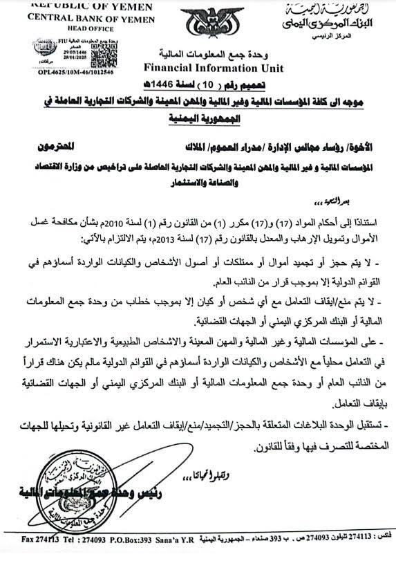 وبحسب التعميم، ستتولى وحدة المعلومات المالية في فرع البنك المركزي في صنعاء التعامل مع بلاغات تجميد الأرصدة أو الحجز عليها أو تعليق التعاملات وإحالتها إلى الجهات المختصة لاتخاذ الإجراءات اللازمة وفقاً للقانون.