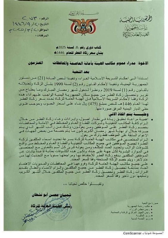 وطالب التعميم، بإلزام المكاتب التنفيذية وشركات القطاع العام والمختلط في الأمانة والمحافظات بخصم زكاة الفطر على الموظفين ومن يعولون، وذلك من راتب الشهر الذي يتم صرفه خلال أو نهاية شهر رمضان الجاري.