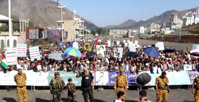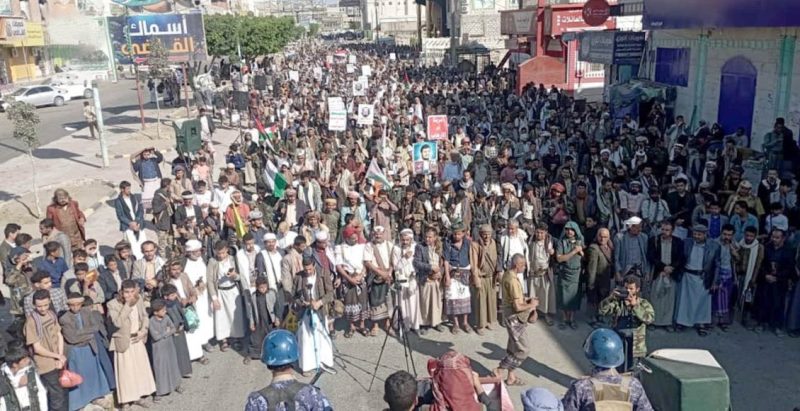 وشارك مئات الآلاف في المسيرات التي عمّت العاصمة صنعاء ومحافظات: حجة والبيضاء وذمار وإب وريمة والضالع، رافعين الأعلام الفلسطينية واليمنية، ومرددين شعارات مناهضة للكيان الصهيوني والولايات المتحدة، التي يتهمها المحتجون بدعم مباشر للعدوان المستمر على قطاع غزة.