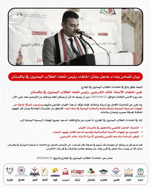 أعربت اتحادات الطلاب اليمنيين في الخارج عن قلقها البالغ بشأن اختفاء الأستاذ خالد الشرعبي، رئيس اتحاد الطلاب اليمنيين في باكستان، والذي فُقد الاتصال به منذ يوم الثلاثاء الموافق 22 أبريل 2025.
