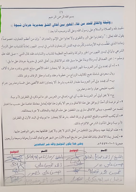 وبموجب الوثيقة، تم الاتفاق على أن يكون الحد الأقصى للمهر 10 آلاف ريال سعودي، إضافة إلى 25 جرامًا من الذهب الخليجي عيار 21.