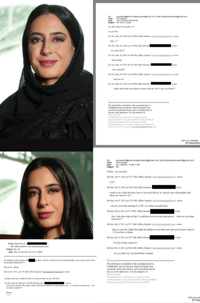 كشفت وثائق بريدية متداولة عن ظهور اسم الدبلوماسية الإماراتية هند العويس في 469 رسالة مرتبطة بجيفري إبستين، تتراوح بين ترتيب لقاءات لفتيات ومراسلات شخصية تعكس علاقة مستمرة منذ يناير 2012.