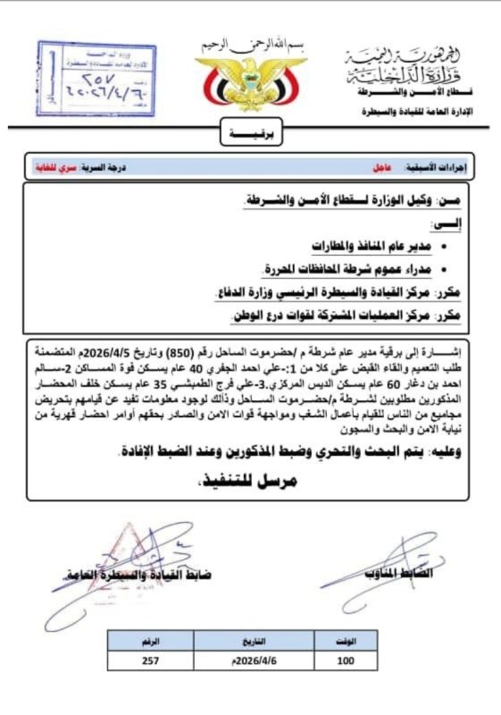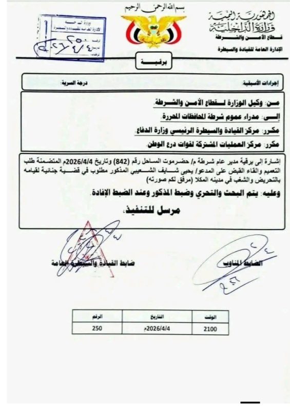 كشفت وثائق أمنية صادرة عن الإدارة العامة للقيادة والسيطرة بوزارة الداخلية عن توجيهات بالبحث والتحري وضبط أربعة من قيادات ما يُعرف بالمجلس الانتقالي الجنوبي المنحل، وذلك على خلفية اتهامات بالتحريض على الشغب في مدينة المكلا، استناداً إلى مذكرات صادرة عن شرطة ساحل حضرموت.